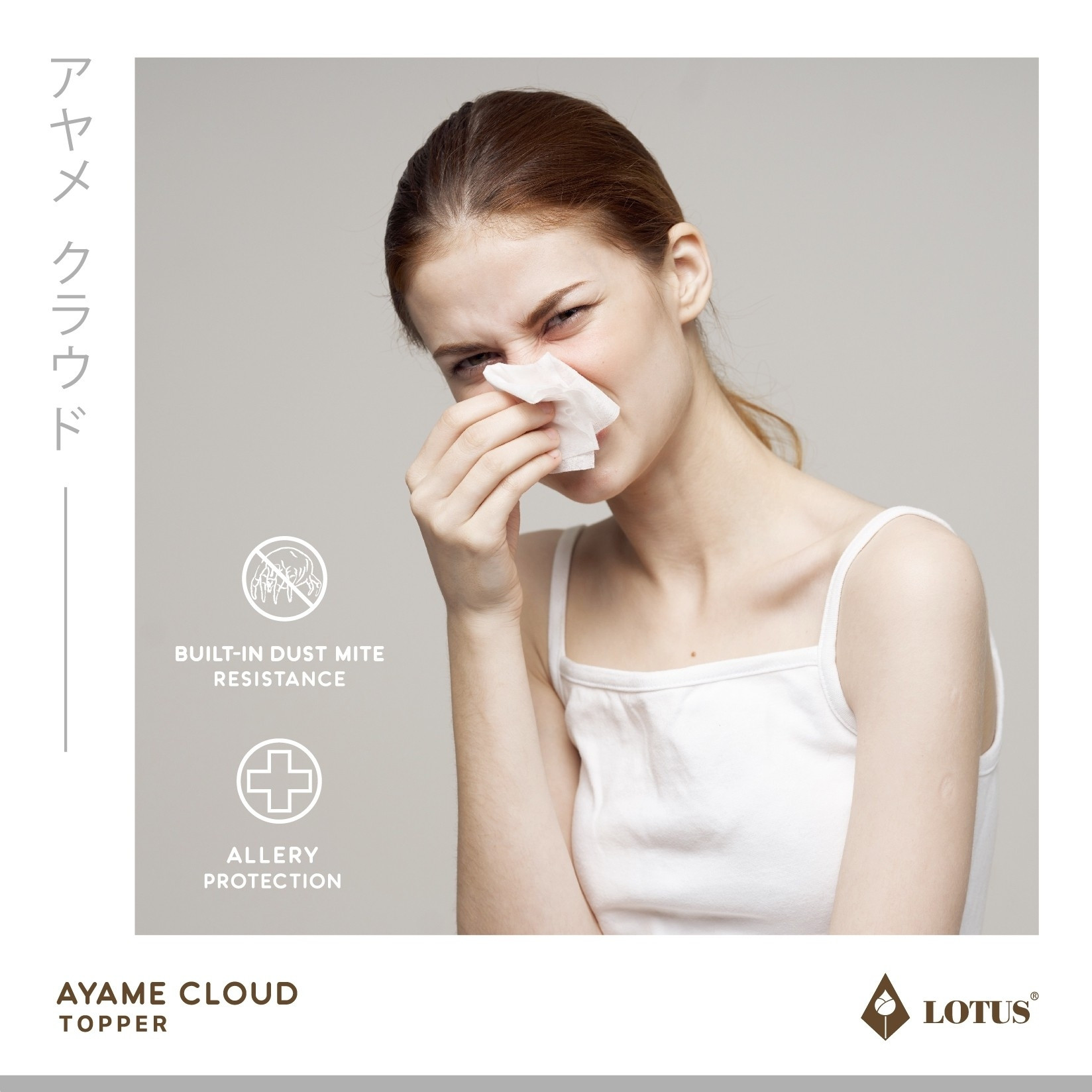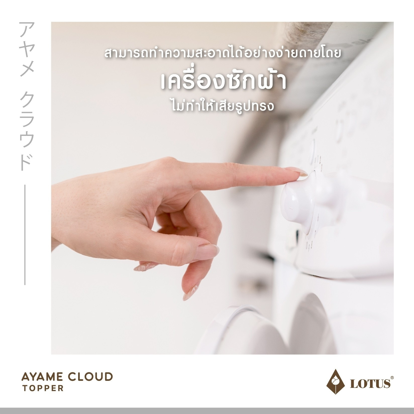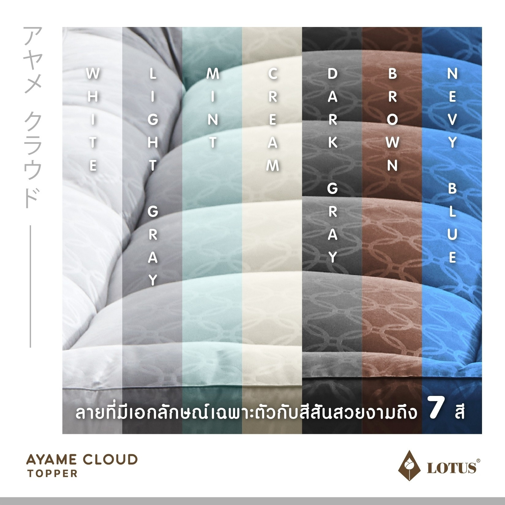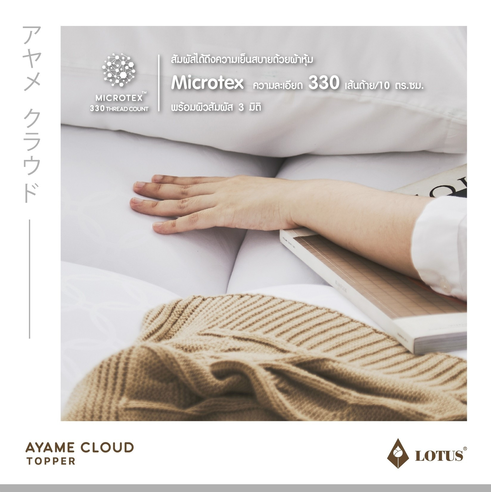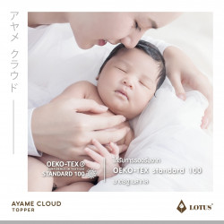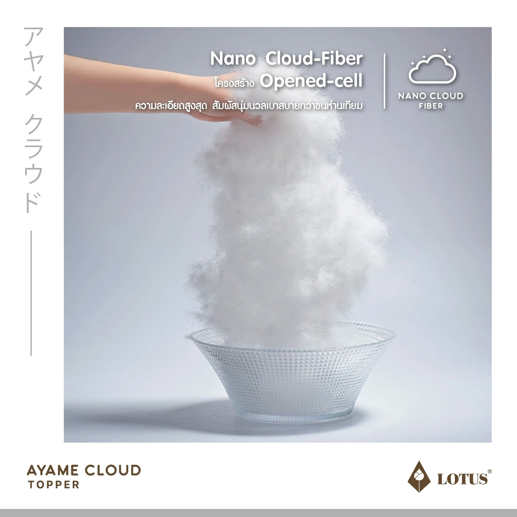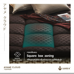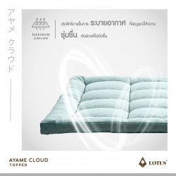 AYAME CLOUD TOPPER ท็อปเปอร์ปุยเมฆหนานุ่มด้วยเทคโนโลยีพิเศษในการผลิตให้ได้ เส้นใย Nano Cloud-Fiber โครงสร้าง Opened-cell ความละเอียดสูงสุด ดุจดั่งใยของปุยเมฆ สัมผัส นุ่มนวลเบาสบายกว่าขนห่านเทียม พร้อมทั้งประสิทธิภาพในการระบายอากาศที่สมบูรณ์ให้ความชุ่มชื่น ต่อผิวแต่ไม่อับขึ้น อีกทั้งสัมผัสได้ถึงความเย็นสบายด้วยผ้าหุ้ม Microtex ความละเอียด 330 เส้นด้าย/10 ตร.ซม. พร้อมผิวสัมผัส 3 มิติ ด้วยเทคโนโลยี Emboss ในการสร้างลวดลายที่มีเอกลักษณ์เฉพาะตัว