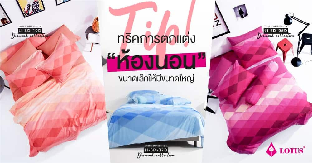 ทางโลตัสจึงได้ผลิตชุดผ้าปูที่นอน Lotus รุ่น Diamond ขึ้นมา เพื่อตอบโจทย์ของคนรักในการตกแต่งห้องนอน ด้วยดีไซน์ออกแนวแฟชั่น ทันสมัย และไลฟ์สไตล์ของคนรุ่นใหม่ จึงเหมาะนำมามิกซ์แอนด์แมกซ์กับเฟอร์นิเจอร์ภายในบ้าน ไม่ว่าจะเป็นเตียงนอน โต๊ะเครื่องแป้ง โต๊ะทำงาน เป็นต้น จะทำให้บรรยากาศภายในห้องนอนโดดเด่นไม่ซ้ำใคร สะท้อนความเป็นตัวคุณได้อย่างชัดเจน หรือสามารถจับคู่ผ้าปูที่นอนลายริ้วที่มีสีโทนเดียวกันมาผสมผสานได้เช่นกัน จะช่วยเสริมพื้นที่ภายในห้องนอนให้กว้าง มีชีวิตชีวา และทันสมัยมากขึ้น