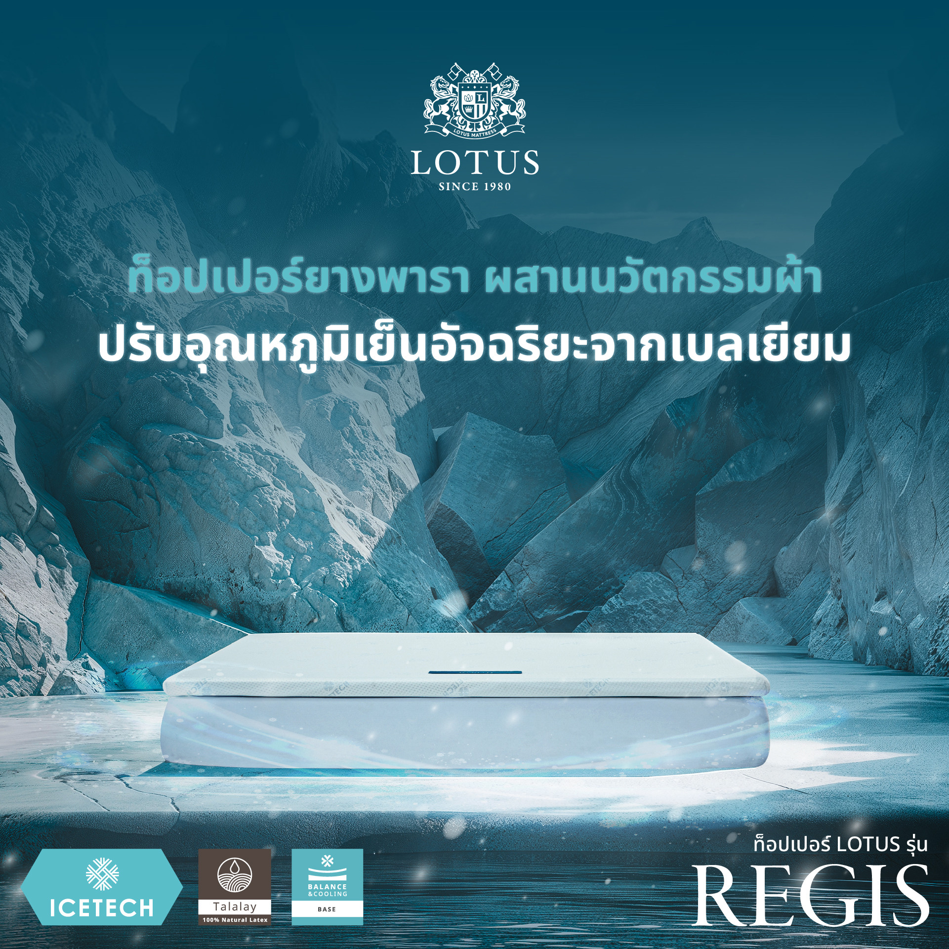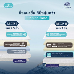 - Regis II ท็อปเปอร์หนา 3 นิ้วรองรับสรีระด้วย Balance & Cooling Base ฐานโฟมนวัตกรรมเฉพาะของ LOTUS ที่มีความยืดหยุ่นสูง ให้คุณรู้สึกสบายไปกับการรองรับที่ไร้แรงกดทับพร้อมช่วยลดอาการปวดเมื่อยที่สะสมมานาน มาพร้อมคุณสมบัติความเย็นของเนื้อโฟมที่มอบความเย็นสบายมากยิ่งขึ้น ช่วยลดปริมาณเหงื่อซึมยามนอนหลับได้อย่างยอดเยี่ยม