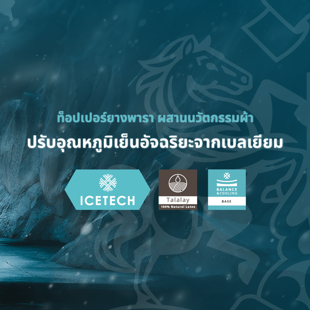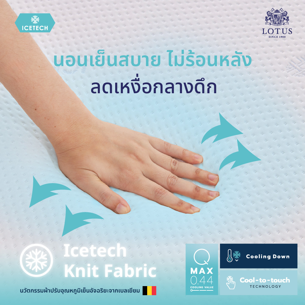 - ICETECH knit fabric ผ้าหุ้มสัมผัสเย็นนวัตกรรมจากเบลเยียม ตอบโจทย์การพักผ่อนที่เย็นสบายด้วยเทคโนโลยี Cool-to-touch ที่ผสานเจลเย็นลงในเส้นใยเพื่อปรับอุณหภูมิร่างกายให้เหมาะสมต่อการพักผ่อน ช่วยให้คุณหลับลึกเร็วยิ่งขึ้น พร้อมลดปริมาณเหงื่อซึมยามนอนหลับและช่วยลดความอับชื้น