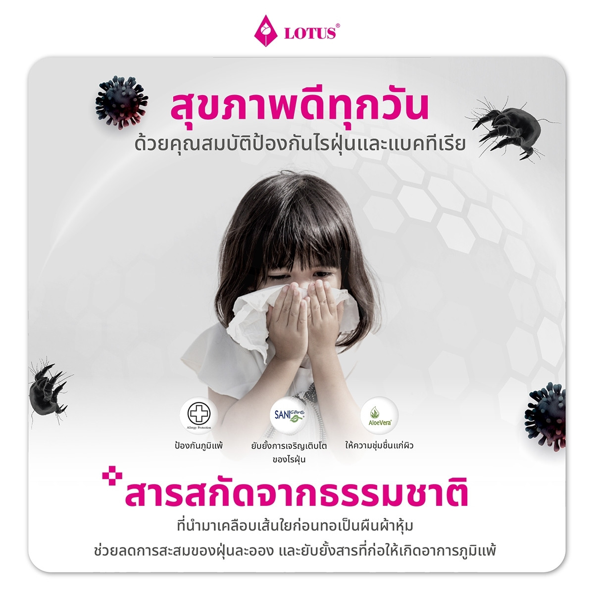 โอบกอดสัมผัสเนียนนุ่มสบายผิวด้วย MicrotexTM นวัตกรรมผ้าหุ้มความละเอียด 330 เส้นต่อ 10 ตารางเซนติเมตร สัมผัสอ่อนโยน ไม่ก่อให้เกิดอาการระคายเคืองต่อผิว มาพร้อมกับคุณสมบัติการระบายอากาศ ลดความอับชื้น และช่วยยับยั้งการเจริญเติบโตของไรฝุ่นและแบคทีเรียซึ่งเป็นสาเหตุของโรคภูมิแพ้ เหมาะสำหรับคนที่ผิวแพ้ง่าย ช่วยให้หลับสนิทตลอดคืนและมีสุขภาพดีได้ทุกวัน